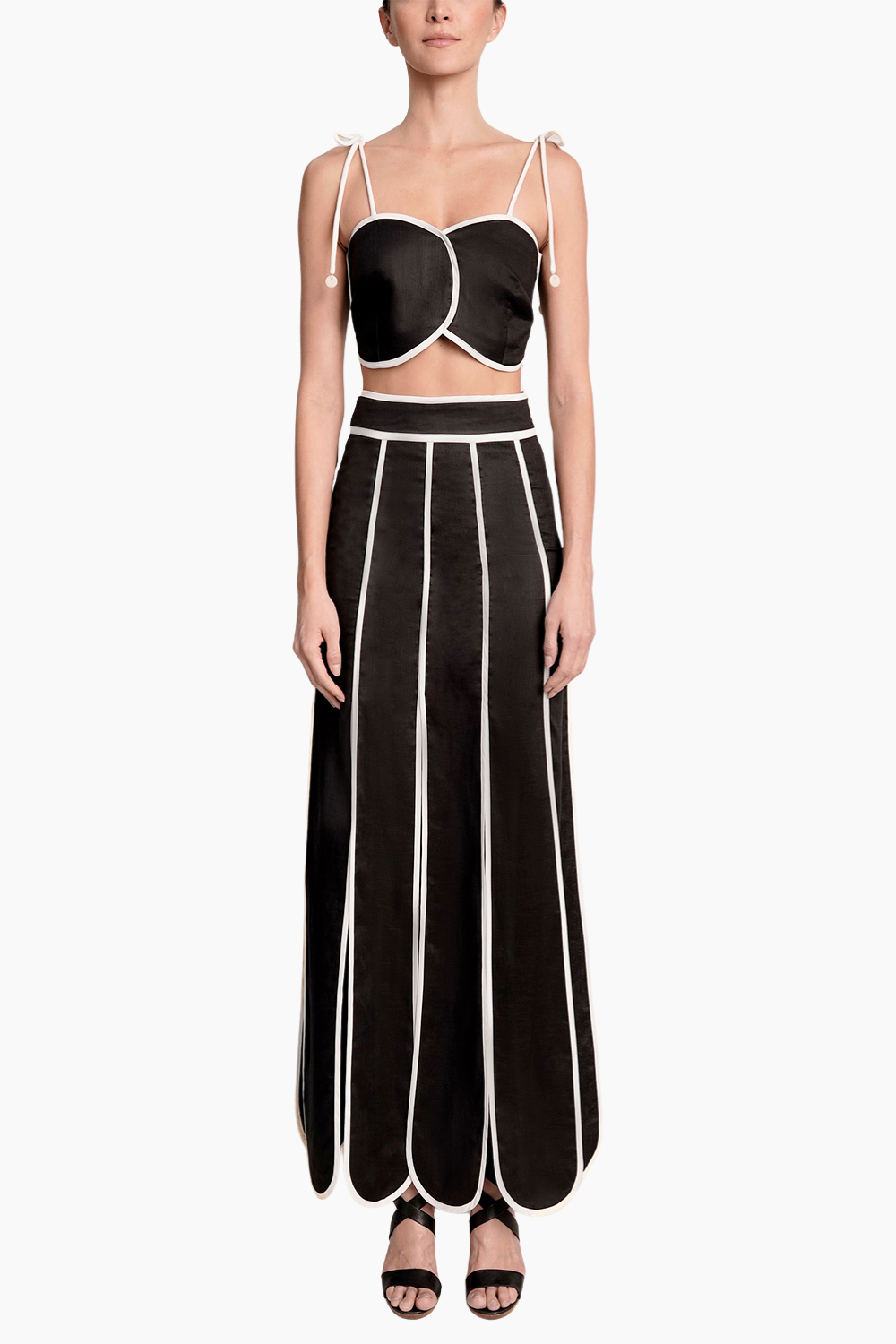 The Aveiro Top, crafted from linen, features a layered design with contrast slits, shoulder ties, and shell accents. A gold back zipper adds elegance. Pair with the Cetina Skirt for a chic daytime look.