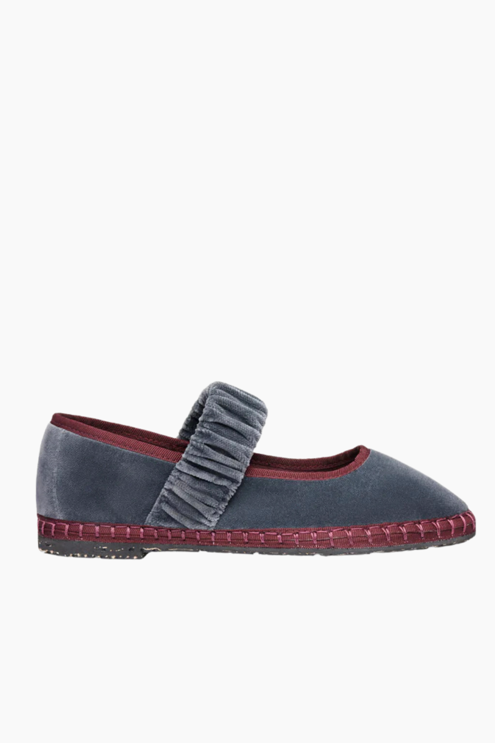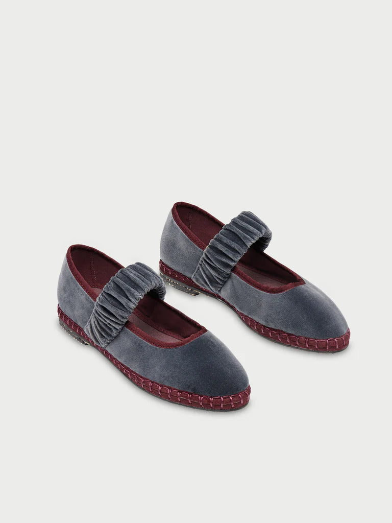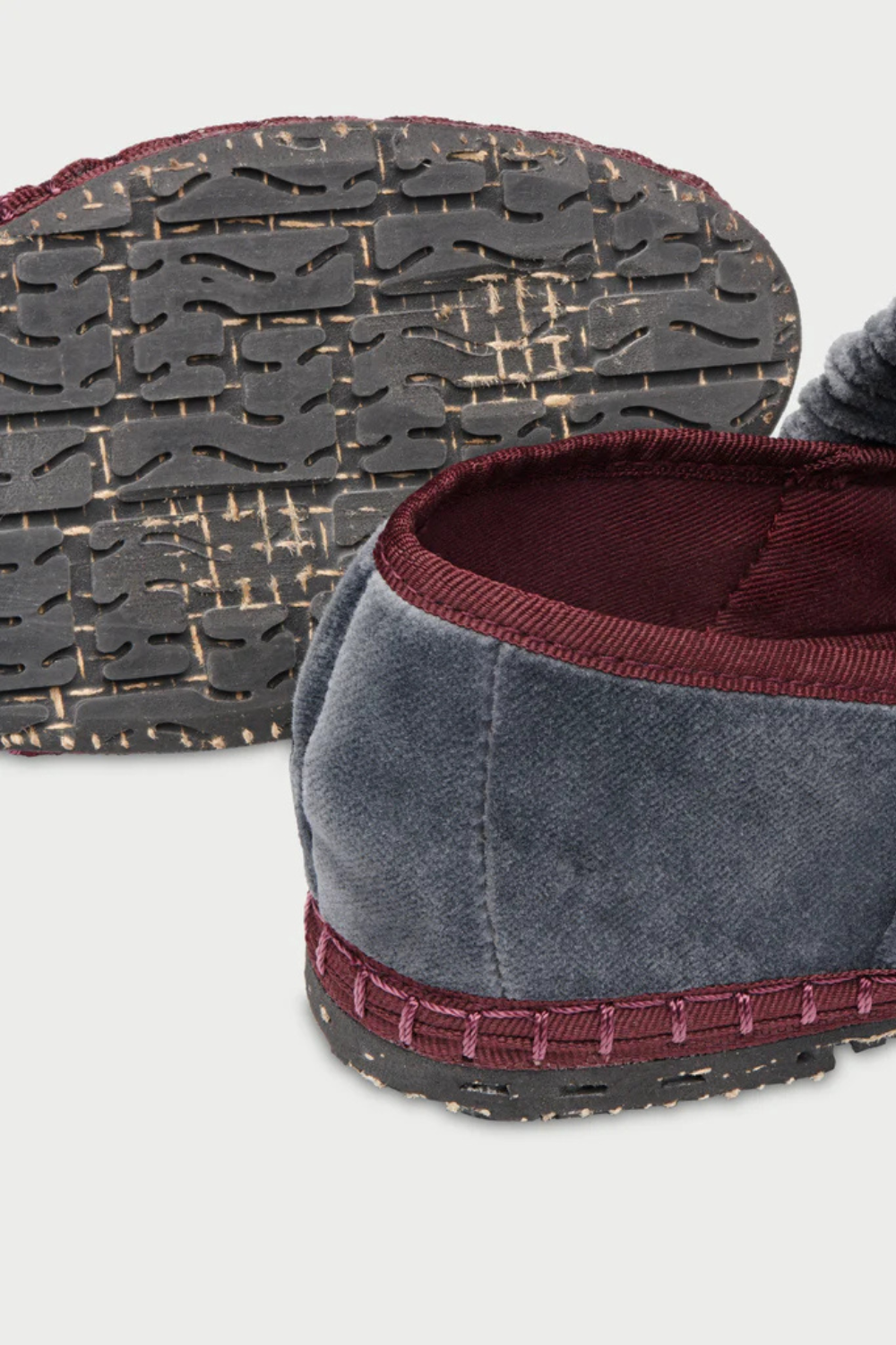 Mafalda Georgina ballerina in soft grey velvet with burgundy piping and velvet lace. Made from 100% cotton velvet with an organic cotton lining treated for freshness. Finished with a recycled rubber sole, this elegant shoe combines timeless charm with sustainable craftsmanship.