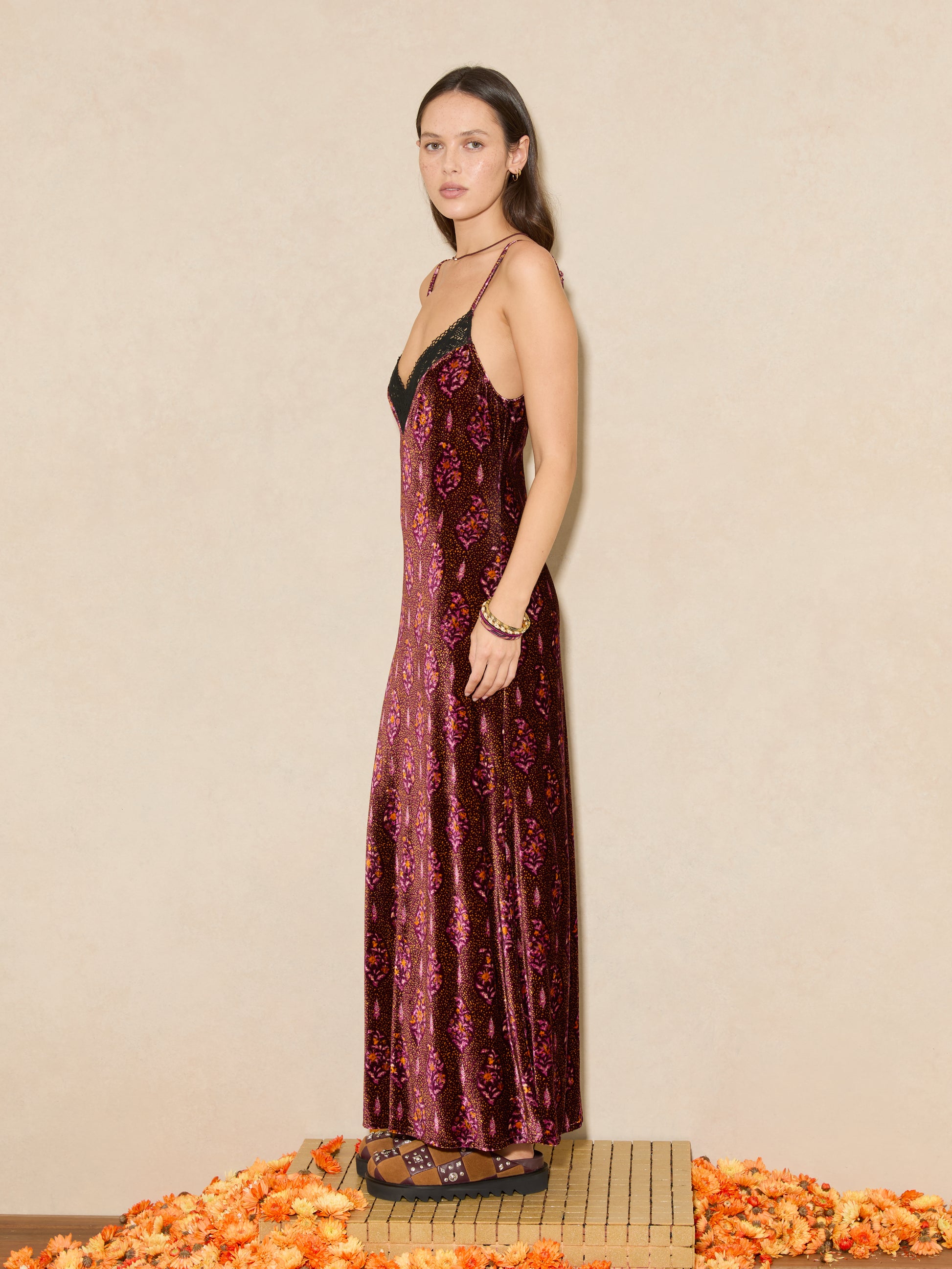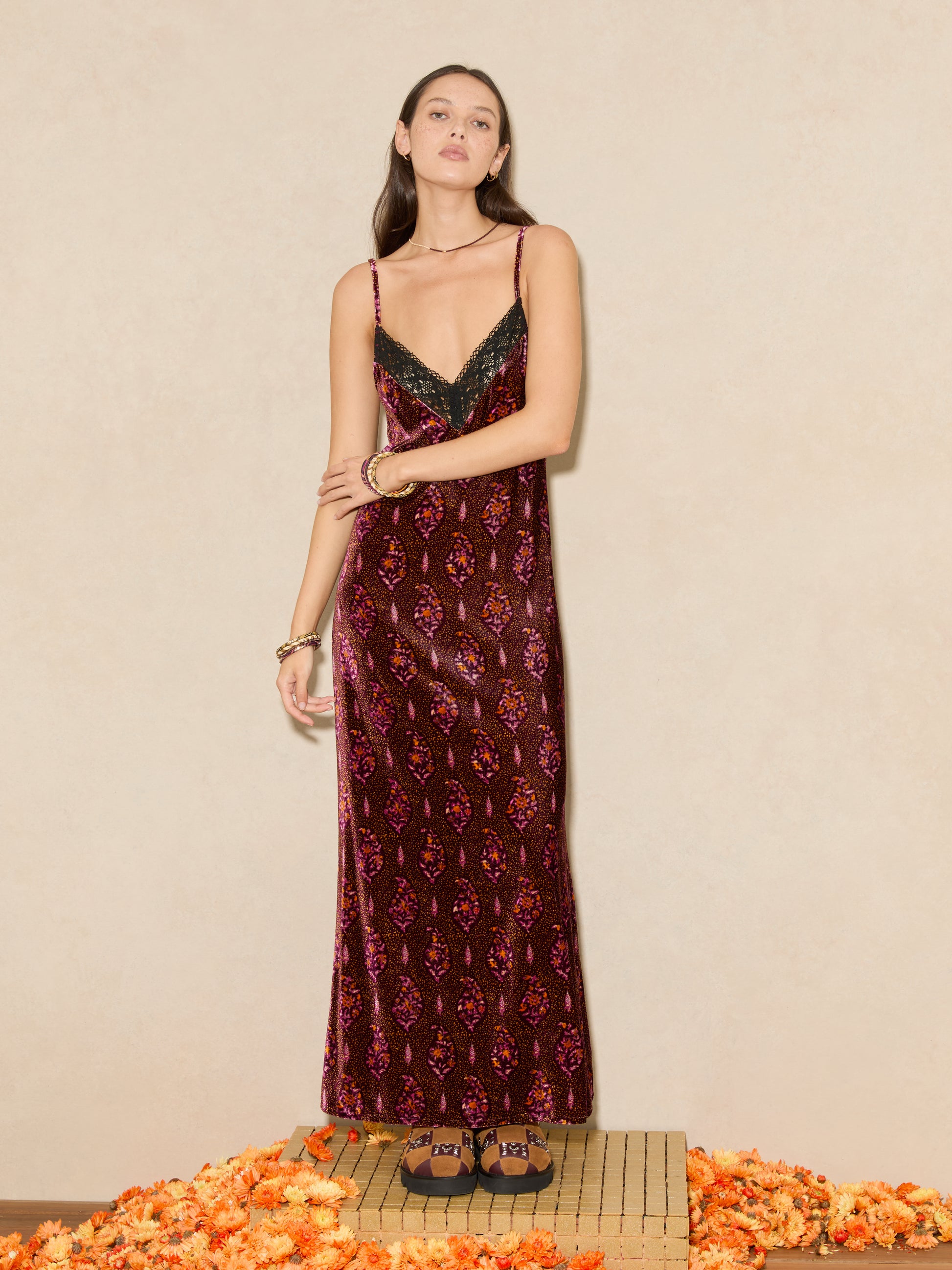 As dusk falls, the Rivoli story embraces Après-sea elegance with silk-velvet’s rich hues and luxe texture. This classic V-neck slip dress in printed viscose silk velvet features our signature hand-drawn floral paisley, cotton lace trim at the neckline, antique brass adjustable straps, and a touch of elastane for comfort stretch.