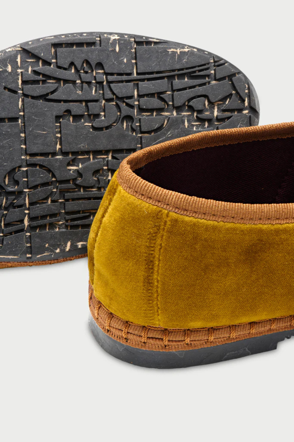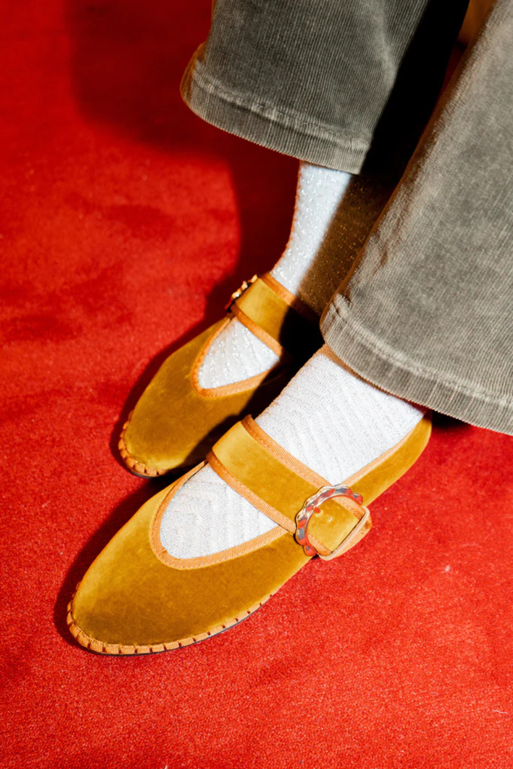 Sophie Mary Jane in mustard velvet with light brown piping and buckle closure. Crafted from 100% cotton velvet with an organic cotton lining treated for freshness. Finished with a durable sole made from recycled bicycle tyres, blending timeless elegance with sustainable design.