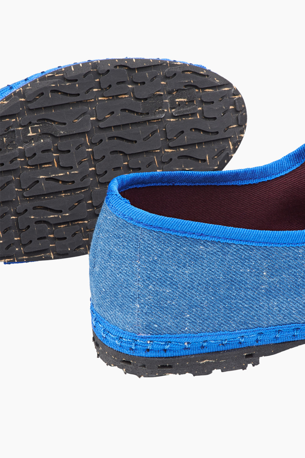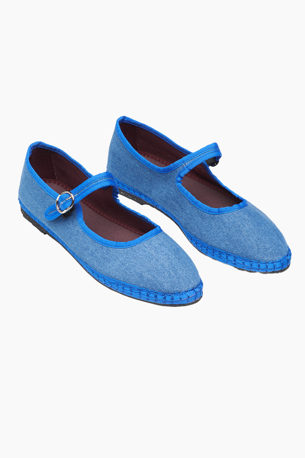 Denim mary jane in dark blue with blue piping and buckle closure. The outside of the shoe is 100% cotton denim, and the inside of the shoe is 100% organic cotton with anti-bacterial treatment. The sole is made of rubber produced from recycled bicycle tyres.