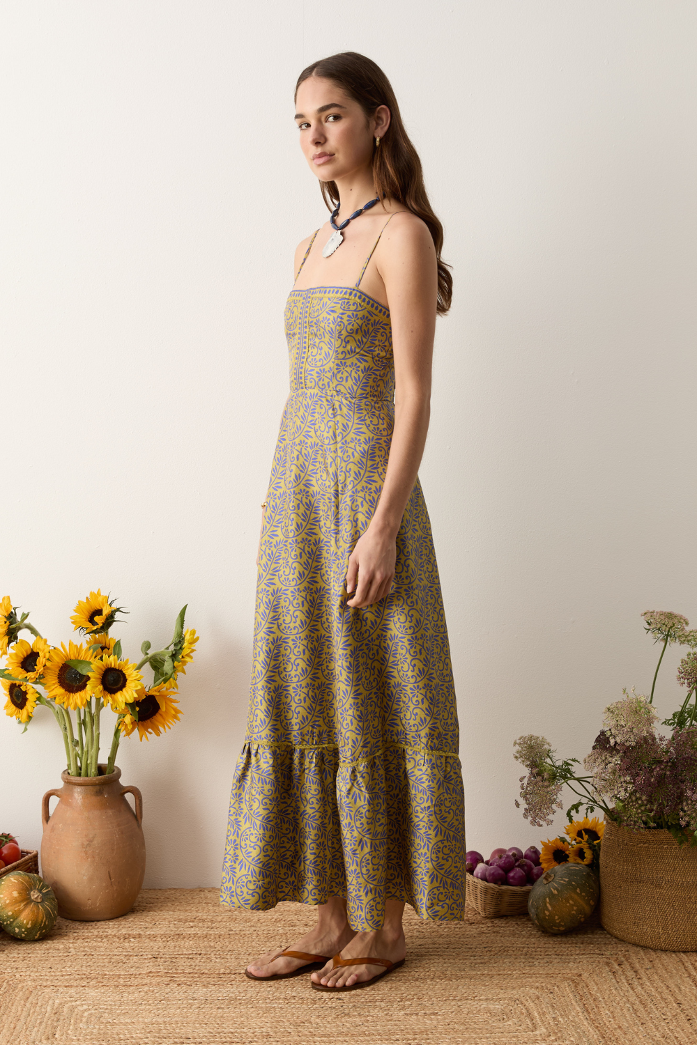 - Maxi dress with square neckline and flared skirt.